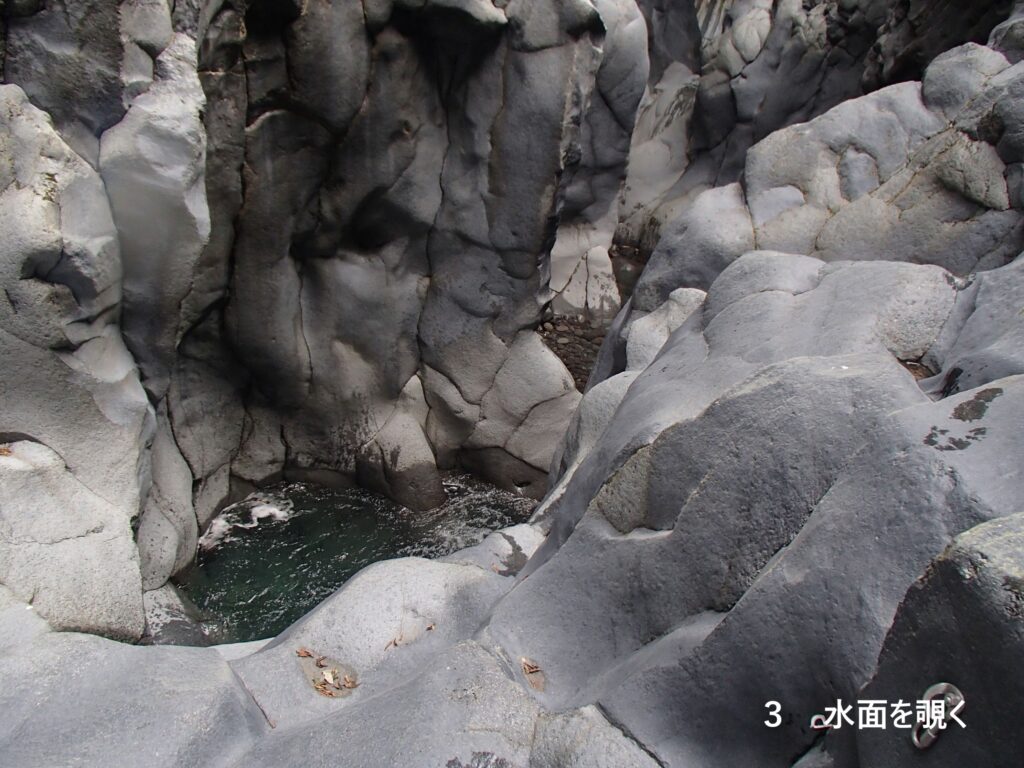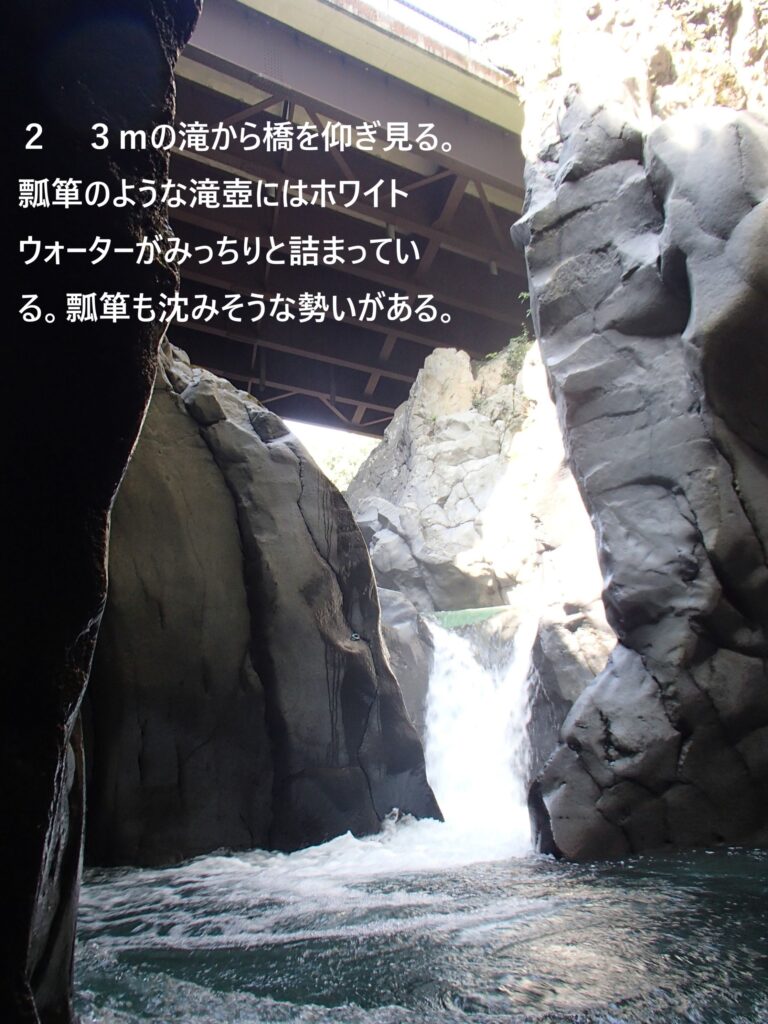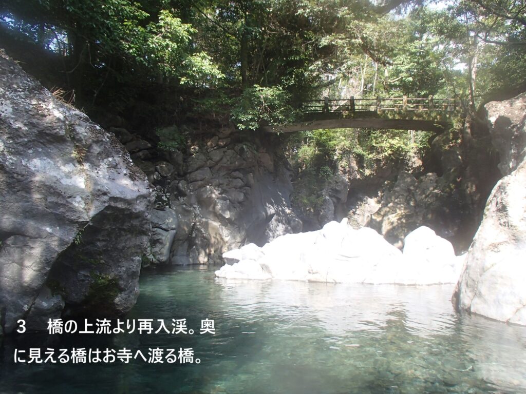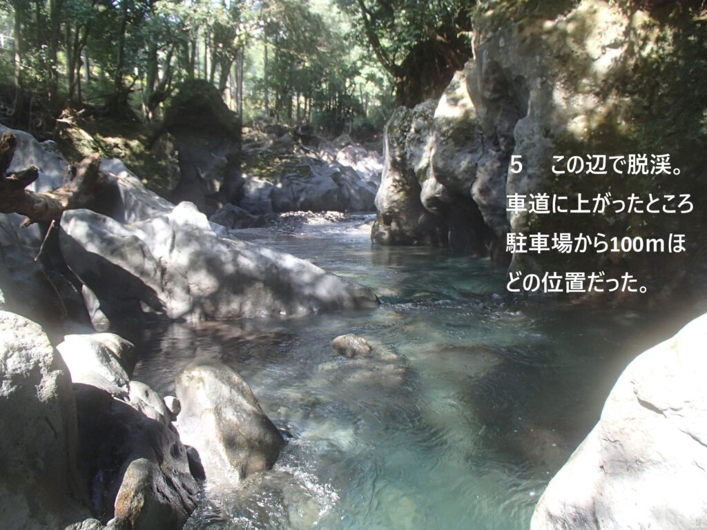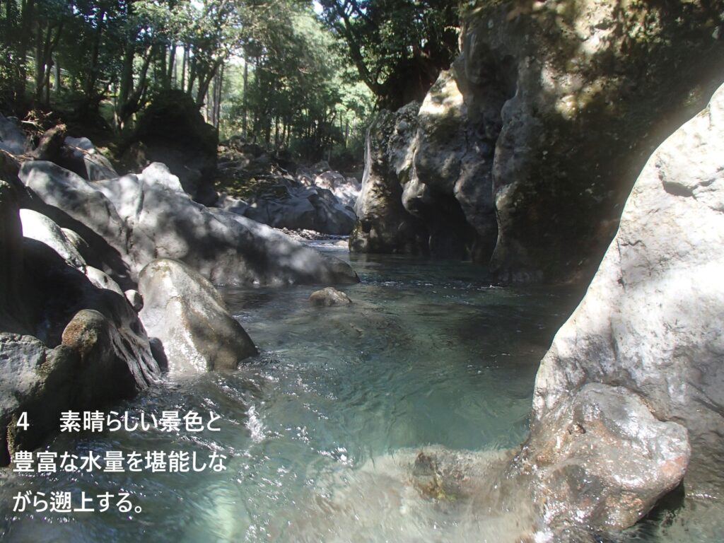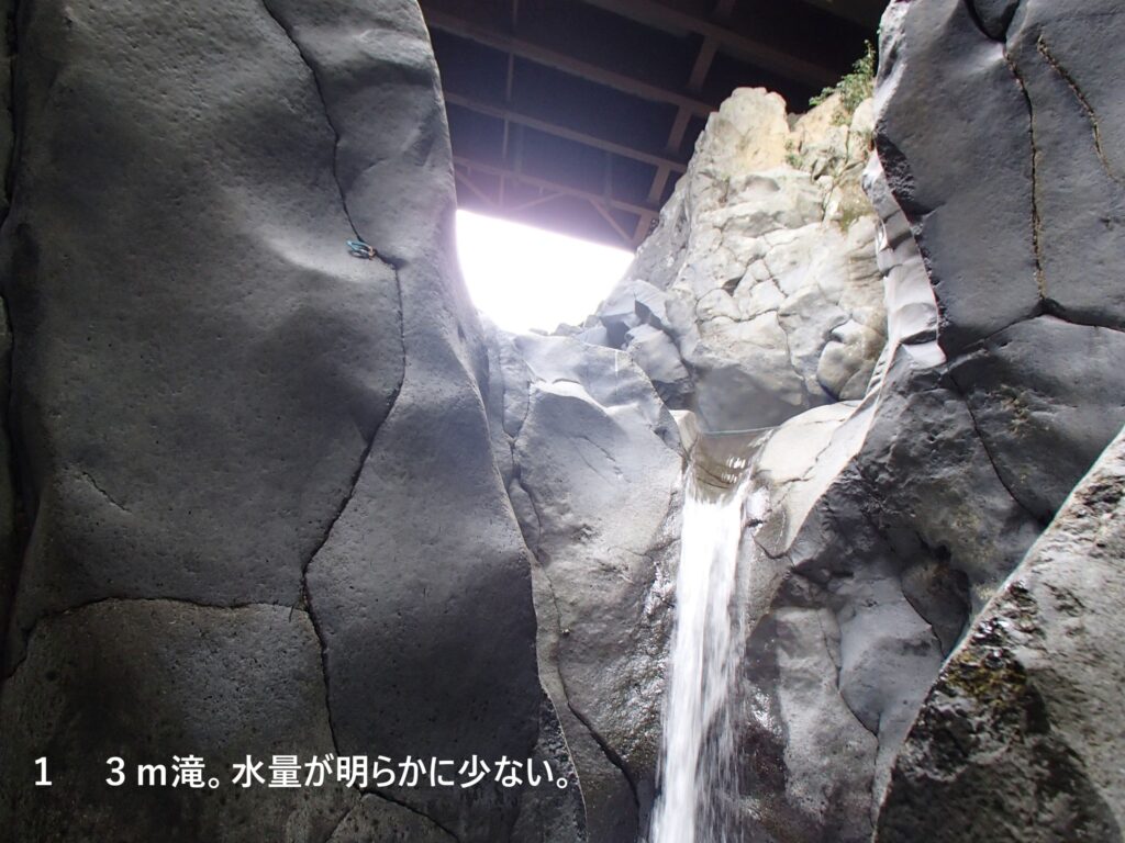 この渓谷、沢登りの対象となるのは500m程度。全体は1時間程度の楽しめる沢です。短いなかに泳ぎ、ヘツリ、滝登攀が含まれた非常に楽しいところとなっています。特に3m滝は「急流の中、側壁にへばり付き、節理にハーケンを打ちこみアブミ登攀をする」という楽しみがあります。駐車場も近く、どこからでも入れるので「ちょっと遊ぶ」には良い沢です。風景も「渓谷」とついているだけあり素晴らしいものでした。水がぬるく、少々汚いことを除けば・・・。少々雨が降り、水が入れ替わったあとに行くのが良いと思われます。
