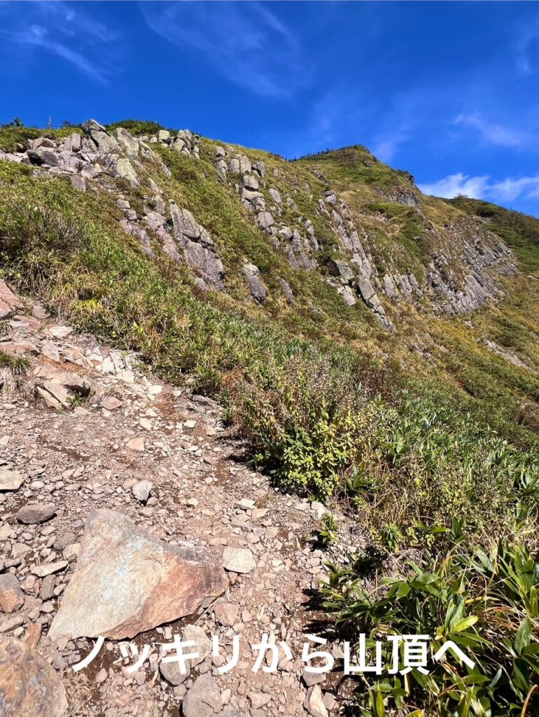 ★登山口に熊注意の看板。ノッキリまでは樹林とブッシュの中の整備された道を苫米地さんが鈴と笛を鳴らしながら私の速度に合わせてゆっくり登って下さった。平坦な道の横の水路も途中で渡ったアライタ沢も澄んだ水が流れていた。熊が気になり何となく心はのんびりできなかった。ノッキリから少し上で展望が開け辺りを見渡せるのでホッとして美しく晴れた秋空と緑の山々を見ながら快適に歩いた。頂上には御社、避難小屋が有り全方位展望有り。とても気持ちの良い秋の登山始めだった。こんな良い日に山に登れて幸せ。お誘い頂きありがとうございました。(小野田)