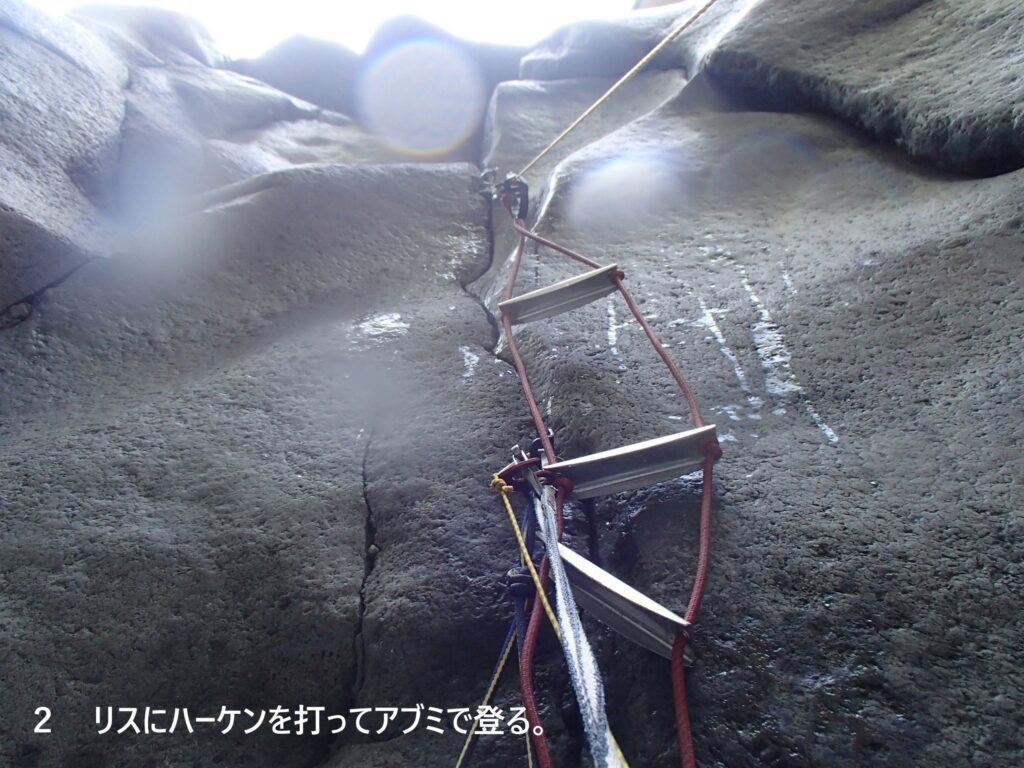 水量が少ないので水中を歩きながら3mの滝を目指す。今回は水量がすくなく、滝壺の半分程度しか泡立っていない。左側壁に走るよさげなリスを選んでハーケンを打つ。1本目は足場の不安定な水中から。水中ではなんとなく立てるが水の勢いがあるため油断していると流されてしまう。
