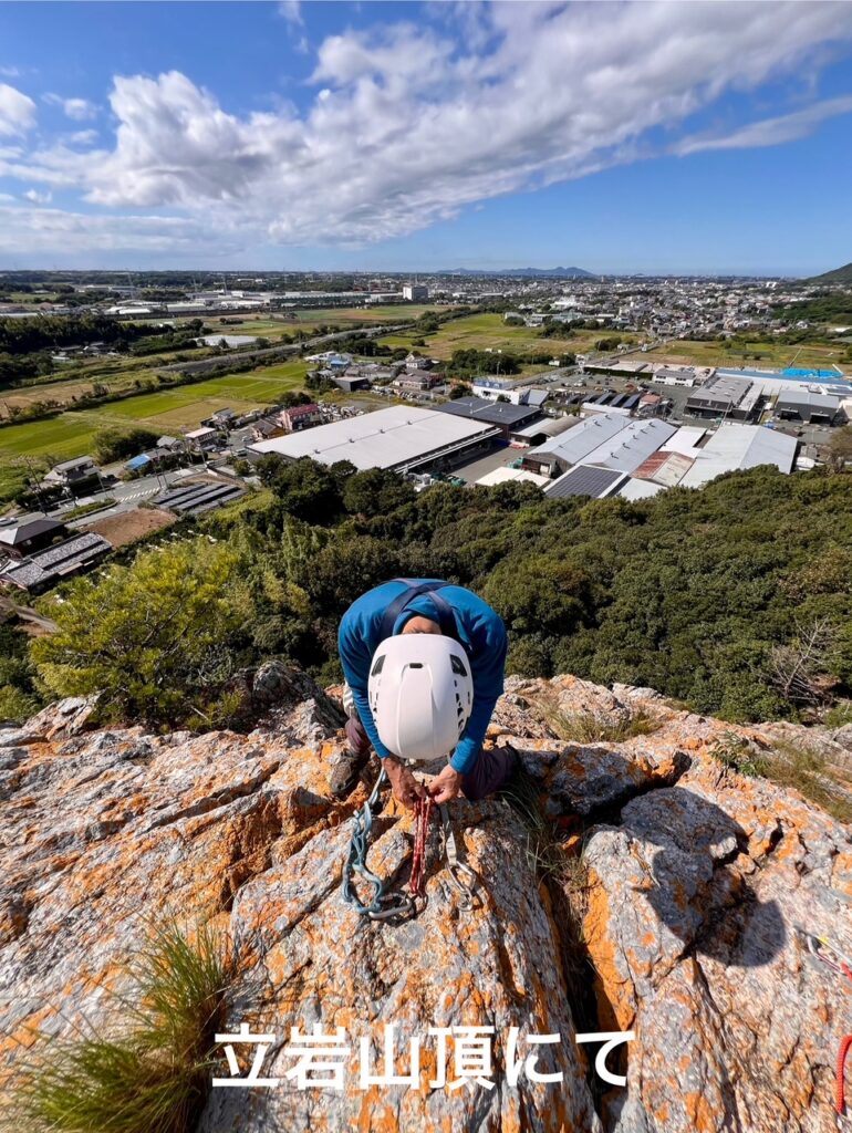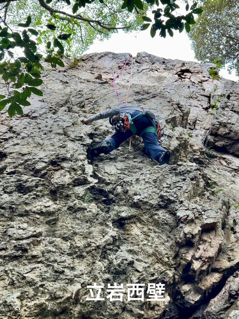★3年ぶりくらいの立岩へ。まず山頂へ。秋晴れだけれども爽やかさはなく暑い!ナント、ツクツクホーシの鳴き声までするではないか。クマ、カメムシ、セミ…みんな狂ってるって。でも待てよ、人間が一番狂ってるのかも。たぶんそうだ。久しぶりの高度感にクラクラしながらロープワークの練習。年に1度だとすぐ忘れること多し。根田さんはさすがホームグラウンドだけあって慣れた足取りで岩場をスタスタ歩く。しかしトレッキングシューズの底が剥がれかけ、さすがにリードではクライミングシューズに履き替えるもこちらも両足とも剥がれかけて、シュリンゲを靴底に巻き付けて登ってゆく。たぶんサンダルでも登れるんだろうな。この日ばかりは根田さんが仙人のように見えた。ともあれこの日登った西壁のルートは苫米地も運動靴で大丈夫でした。(苫米地)