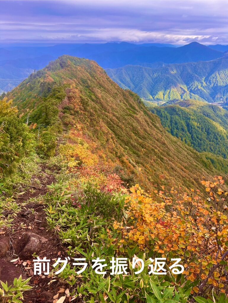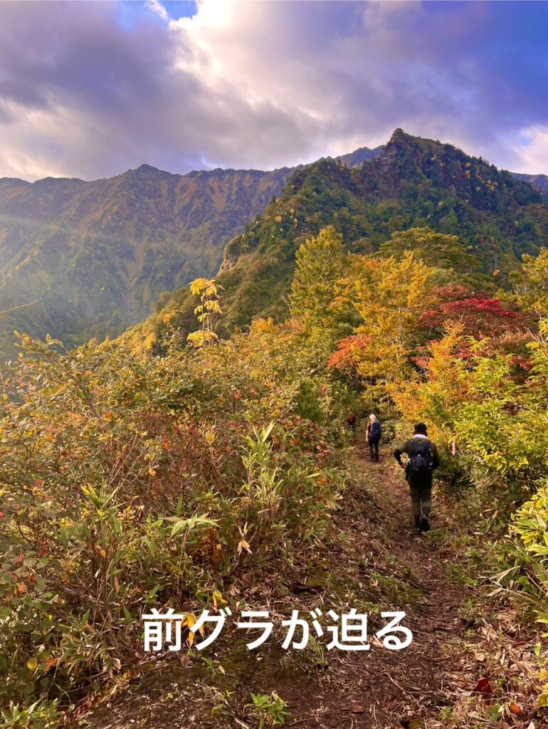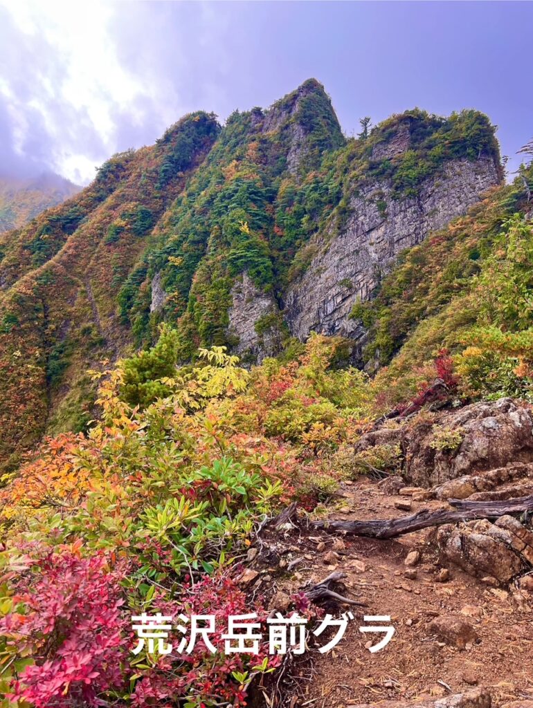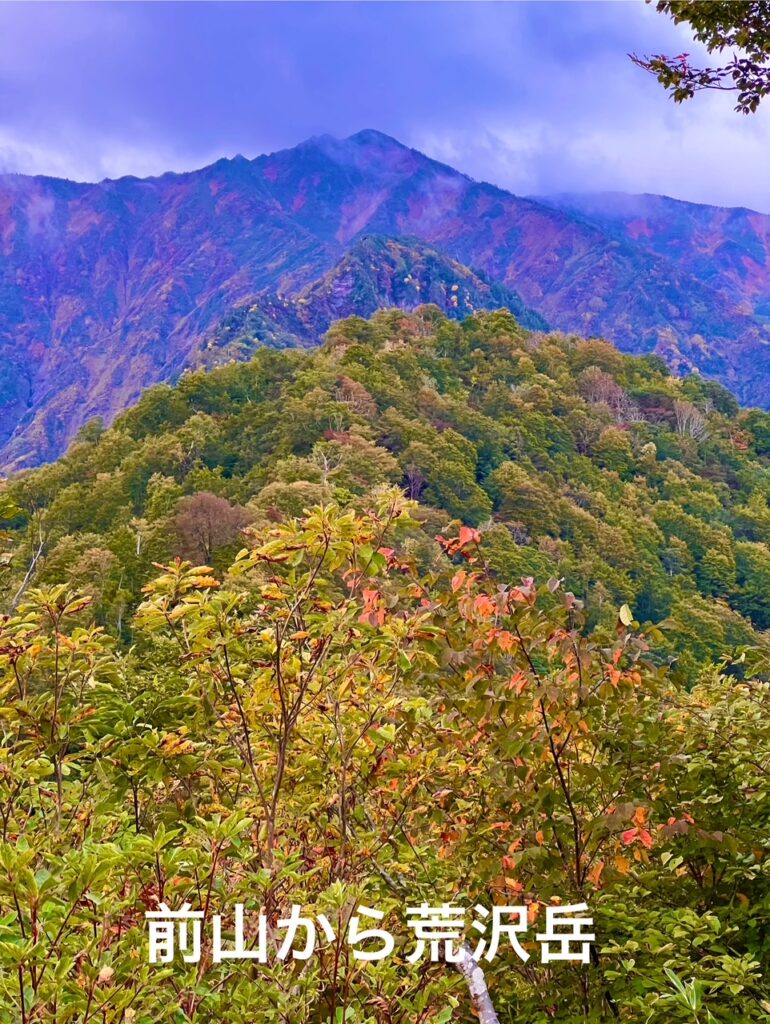 ★登山口5:40、登り始めて2時間半で前グラ下に到着、ヘルメットを装着して気合いを入れて前グラまで約1時間、鎖・ロープの岩場を通過、前グラからは紅葉している尾根沿の登山道を歩き荒沢岳。前グラからの下りが心配だったがブッシュなどもあり思ったより心配なかった。13:30登山口。銀山平キャンプ場の温泉はカメムシ大発生の対応のため入浴できなかったので、車で移動して白銀の湯に入浴した。(鈴木)