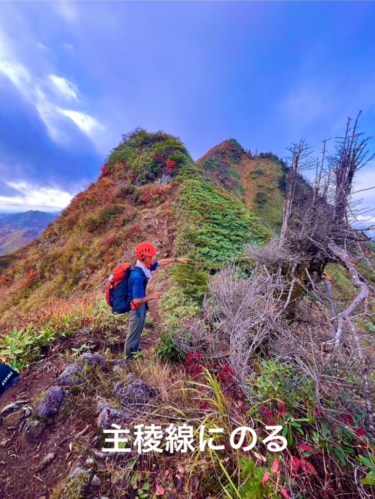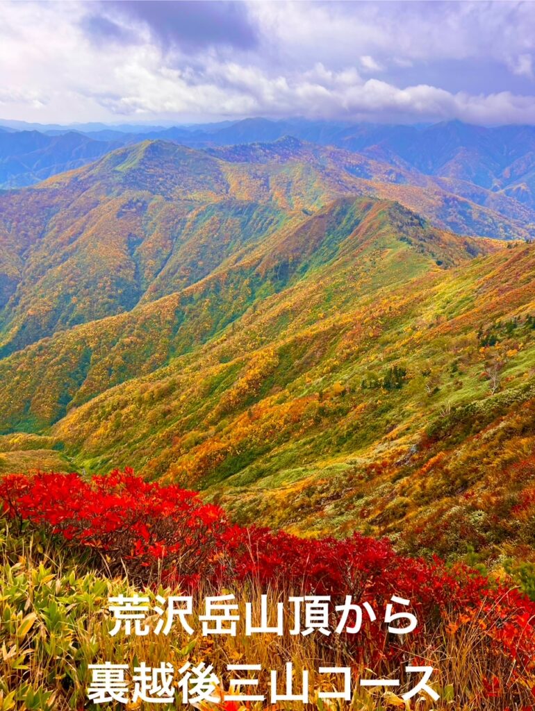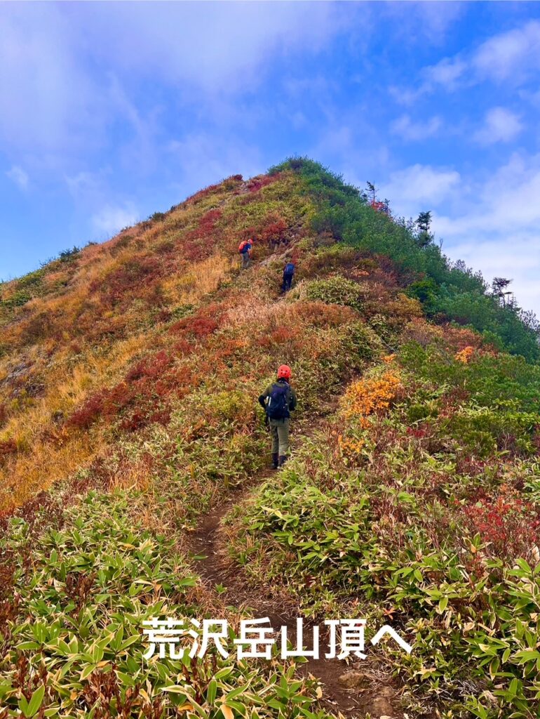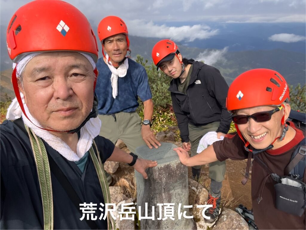 ★登山口は銀山平キャンプ場から車ですぐの距離です。登山口の看板には「難所の鎖場は、豪雪による破損を防ぐため、必要最小限しか設置していません。本格的登山の経験が無い方は、引き返す勇気を。」とあり、気を引き締めて入山します。前山を越えて前嵓下まではとても歩きよいハイキングコースです。それが前嵓の登りにかかるや鎖場とハシゴのオンパレードで息つく間もありません。ようやく前嵓にかじくり上がるとめざす荒沢岳山頂が近づきますが、ここから主稜線にかけて傾斜がどんどん急になり、トレッキングポール無しだと他のメンバーに離されてしまいます。主稜線に飛び出して岩稜のトラバースと最後の鎖場を越えるとさしもの荒沢岳もかわいい小山に。3人からやや遅れてゆっくりと山頂を踏みしめます。仲間4人で力を合わせて登ったぶん嬉しい山頂です。山頂のさき本来なら歩くはずだった裏越後三山の縦走路は紅葉に染まっていました。午後はまた降雨の予報があり、降り出す前に前嵓を下らねばと後ろ髪を引かれる思いで山頂を後にしました。前嵓の鎖場の通過に際しては、自分は沢用の軽量ハーネスから伸ばしたスリングにオートロックの安全環付カラビナをつけて鎖にかけ、自己確保しながら登降してみました。カラビナの径が大きいのでスムーズに流れ、煩わしさなく安心して通過できました。最近はなんでもない所でもつまずくことが増えてきたので、今後はこの方法で安全確保を図ろうと思います。前嵓を無事下り終えてからは登山口まで余韻を噛みしめながら歩きました。なんとか雨が降り出す前に下山できましたが、キャンプ場に着くと荒沢岳はスッポリと雲のカーテンに隠れていました。さて下山後のお楽しみは本日もキャンプ場の温泉でしたが、ナント!カメムシ大発生で15時まで臨時休業に。そこで車で6分ほどの白銀の湯へ。こちらもカメムシ大発生中でしたがなんとか営業中でホッ。(苫米地)