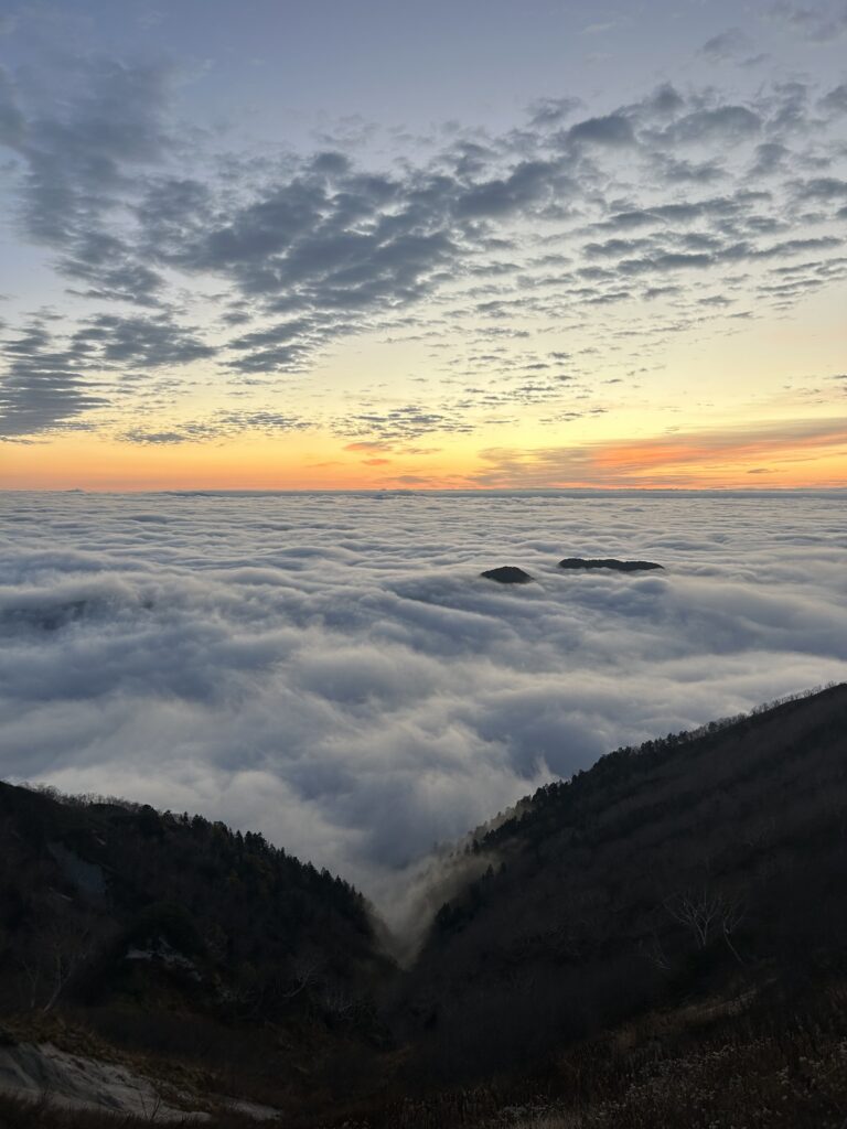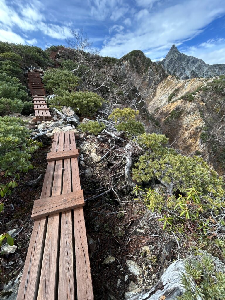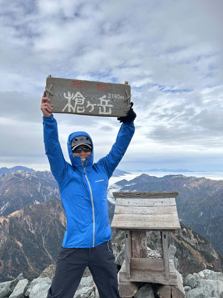 ほぼ垂直の岩場は、標高差は稼げますが体力がかなり消耗する。天候にも恵まれ、山頂に到着し、素晴らしいパノラマ景色を拝む事ができた。下山を考えると嫌になりましたが、山頂からは引き返すしかないのが登山。同行者と声を掛け合いながら、鎖場を通過し、無事に怪我なく下山する事ができました。1日目と同様、下山後の温泉に癒されました。(永井)